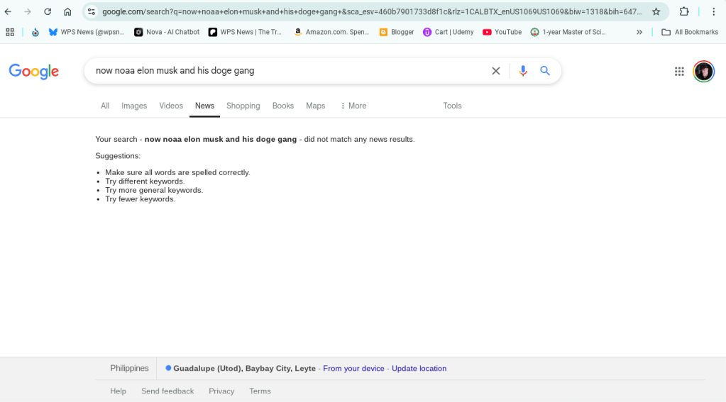Curious about this situation, I decided to look it up on Google. At first, I didn’t find much at all under news searches (see screenshot). Then, when I changed my search to “NOAA Elon Musk and his Doge,” I found some interesting stuff. The only major news source covering this story was The Guardian, which made me wonder why there isn’t more buzz about something so important.
