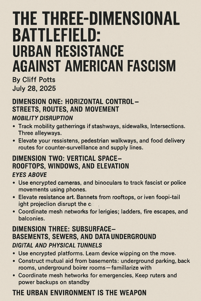In traditional military doctrine, urban combat is three-dimensional: up, down, and sideways. Rooftops, basements, and every alley in between become contested space. What the RAND Corporation once analyzed to help U.S. forces subdue cities abroad, we must now adapt to resist fascist forces at home.