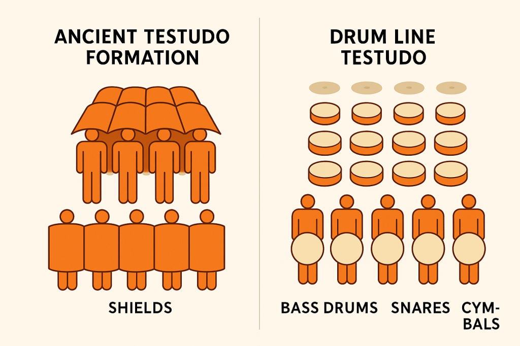 Instead of soldiers, picture a drum line at a music event — bass drums up front, snares overhead, cymbals to the sides. They move in tight formation through a crowd, not to break a siege, but to create a visual and auditory spectacle.