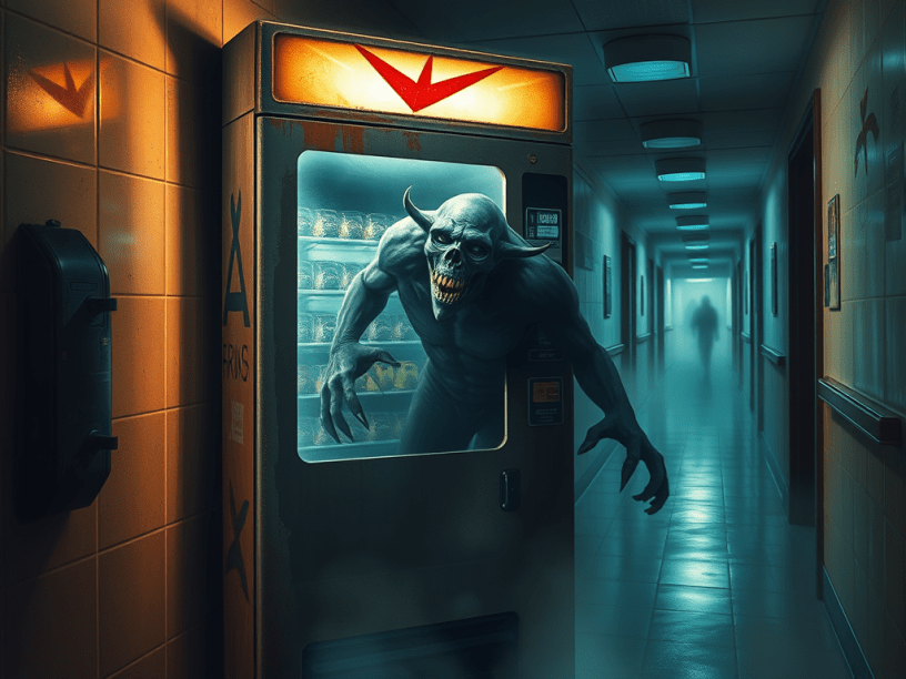 A voice, raspy and faint, whispered from the depths of the vending machine: “You came for a snack… but it’s you that will be served.”