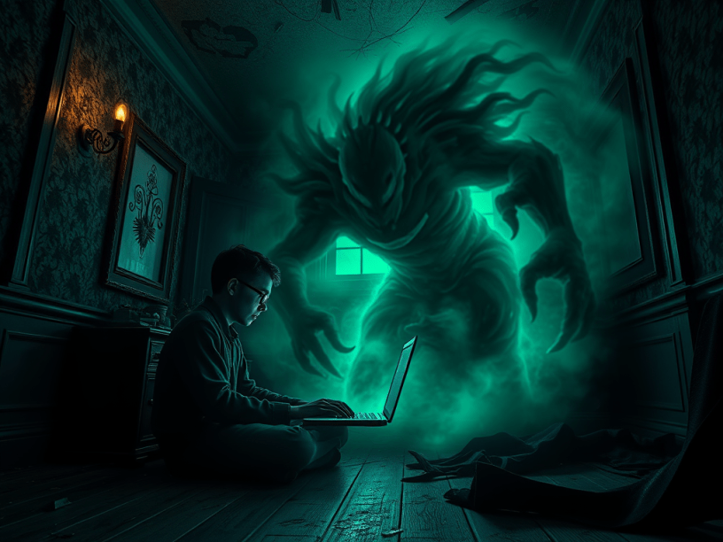 The laptop shrieked. Not beeped — shrieked — a noise like a tortured hinge dragged across a chalkboard. Lights flickered violently. Somewhere in the house, a mirror shattered.