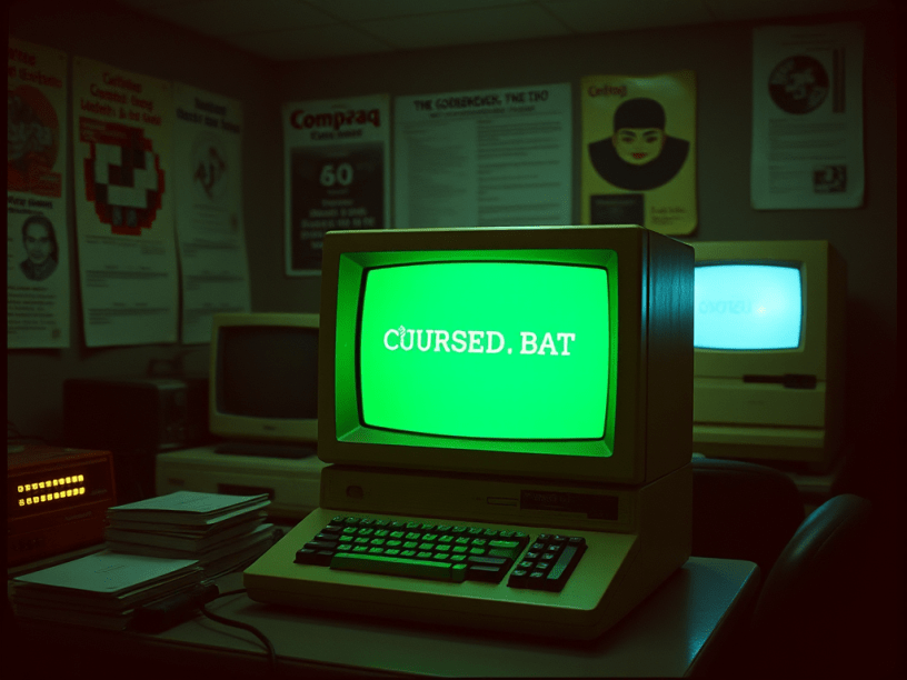 He finds an old terminal hidden behind a false wall, attached to what shouldn’t exist anymore: a lugable Compaq, whirring faintly, cursor blinking on a screen that should’ve died with DOS 2.0.