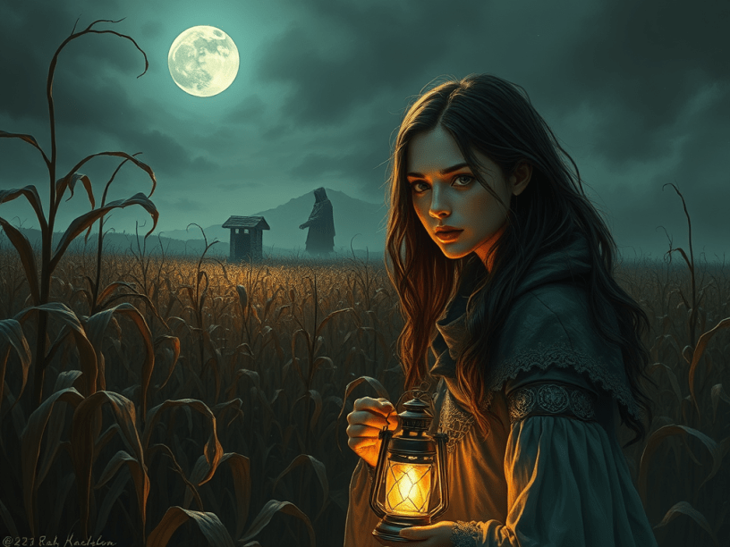 Sarah stood in the center of the field, her lantern casting a dim light over the rows of withered corn, the husks dry and brittle under her fingers. The fields stretched out in every direction, empty and silent, save for the hum that seemed to grow louder the longer she stood.