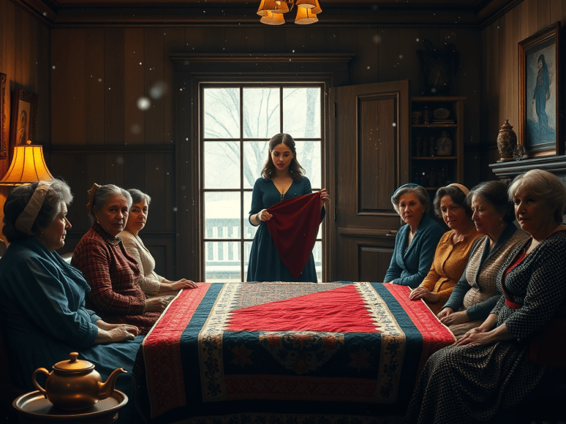 In the parlor of Mistress Abigail Phelps, the married women of Ash Hollow gathered, hands red from the cold, but needles swift and sure. The quilting frame had been set up days before, and now it loomed like a wooden altar in the center of the room—around it, nine women, all wrapped in wool and worry.