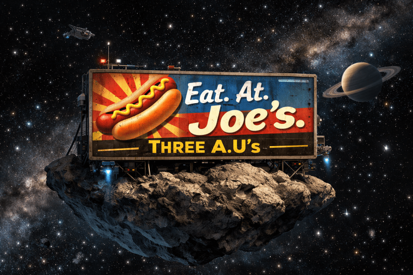 This one was larger. Animated panels cycled colors slowly to conserve power. It advertised a chain none of them recognized, offering fresh protein and oxygenated seating in five astronomical units. The font was friendly. The asteroid it was mounted on tumbled slightly, and the sign compensated with constant micro-adjustments, desperate to be seen.