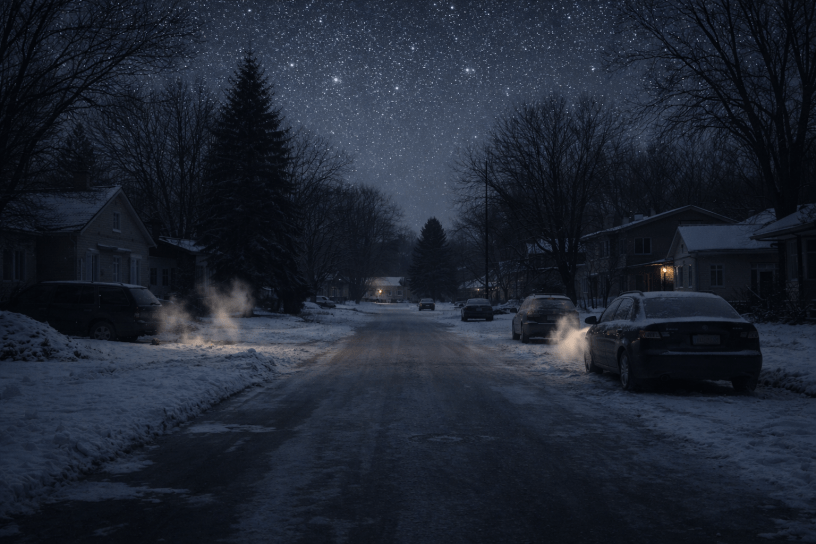 Streetlights went out together, clean and final. Inside, the furnace cut off mid-cycle. The quiet that followed felt intentional, like a decision.