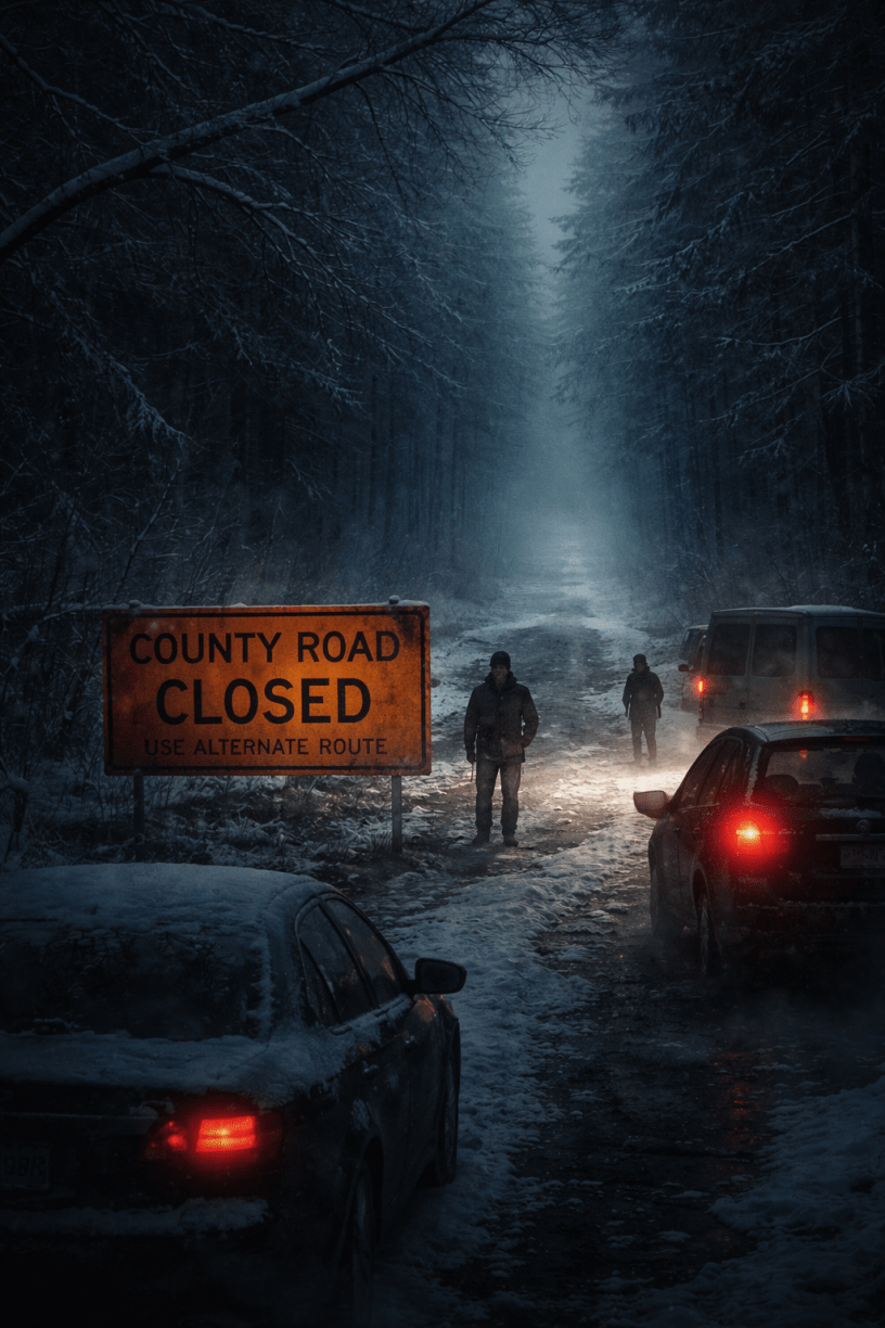 That was the first thing Marla Jensen thought as her headlights swept across it: COUNTY ROAD CLOSED – USE ALTERNATE ROUTE, black letters on reflective orange, planted dead center in the snow-packed shoulder like it had grown there overnight.