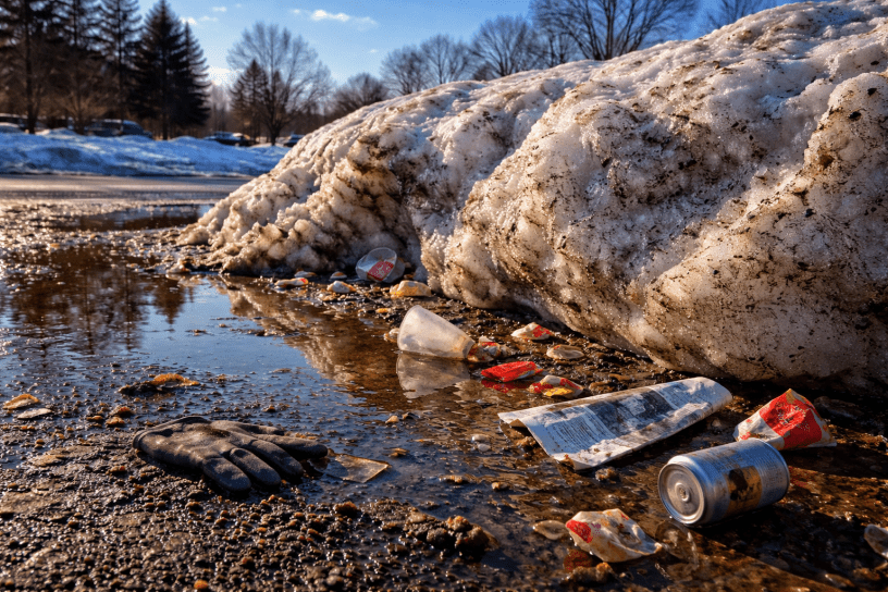 Winter had done us the favor of hiding it. Snowbanks rose like polite barricades along roads and parking lots, pushed up by plows that never asked what they were moving, only where. Cups, wrappers, bags, broken toys, receipts, gloves, cigarette packs—all of it disappeared into white walls that looked clean from a distance and merciful up close. We told ourselves it was temporary. We told ourselves spring would take care of it.