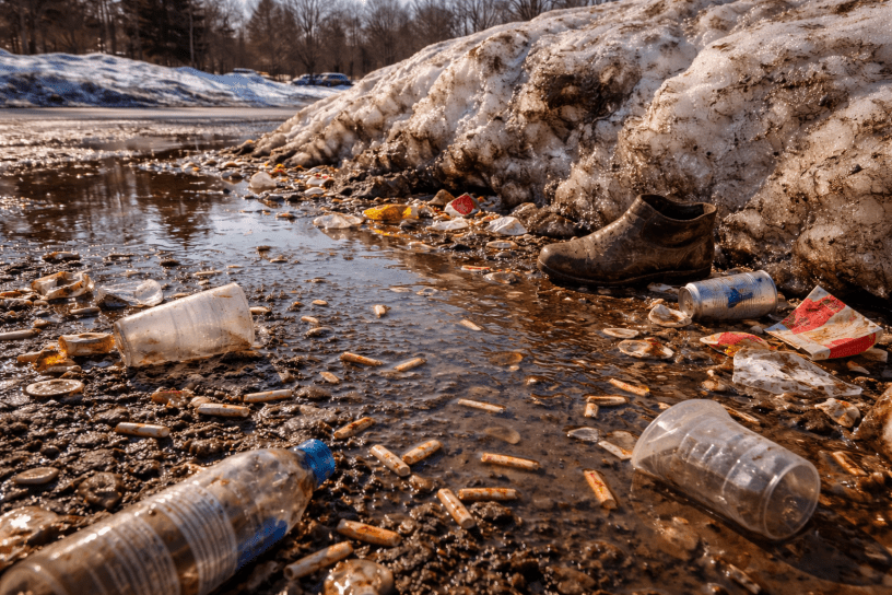 Parking lots turned into shallow deltas of slurry, gray-brown water carrying the season’s leavings into every low place. Gutters filled. Curbs disappeared. The snowbanks shrank and the trash expanded, until it felt as though the debris outweighed what had hidden it. As if winter had not been covering our waste at all, but compressing it—feeding it—allowing it to reproduce in the dark.