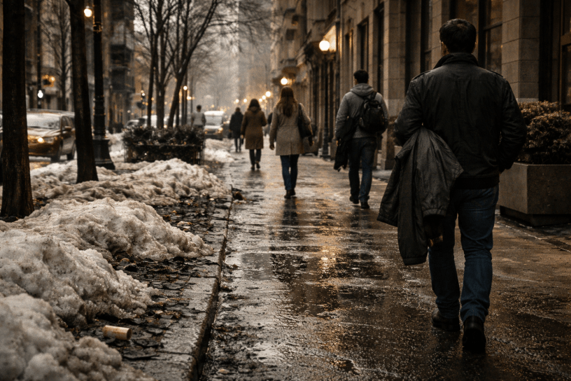The snow went first. Not all at once, not cleanly. It pulled back in patches, revealing the dull black of pavement and the gray film winter always leaves behind. Meltwater ran along the gutters, carrying grit and old salt, loosening things that had been held in place by cold alone. The city didn’t look renewed. It looked uncovered.