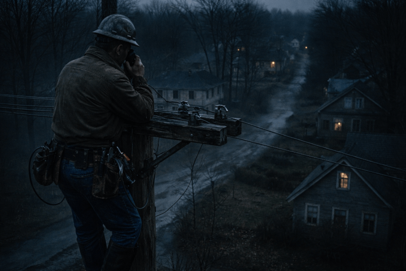 I climbed my first pole that afternoon, spikes biting into wood softened by thaw. From up there, you see things you don’t notice at street level. Curtains drawn in houses that used to keep them open. Yards untouched. Porch lights off long before dusk.