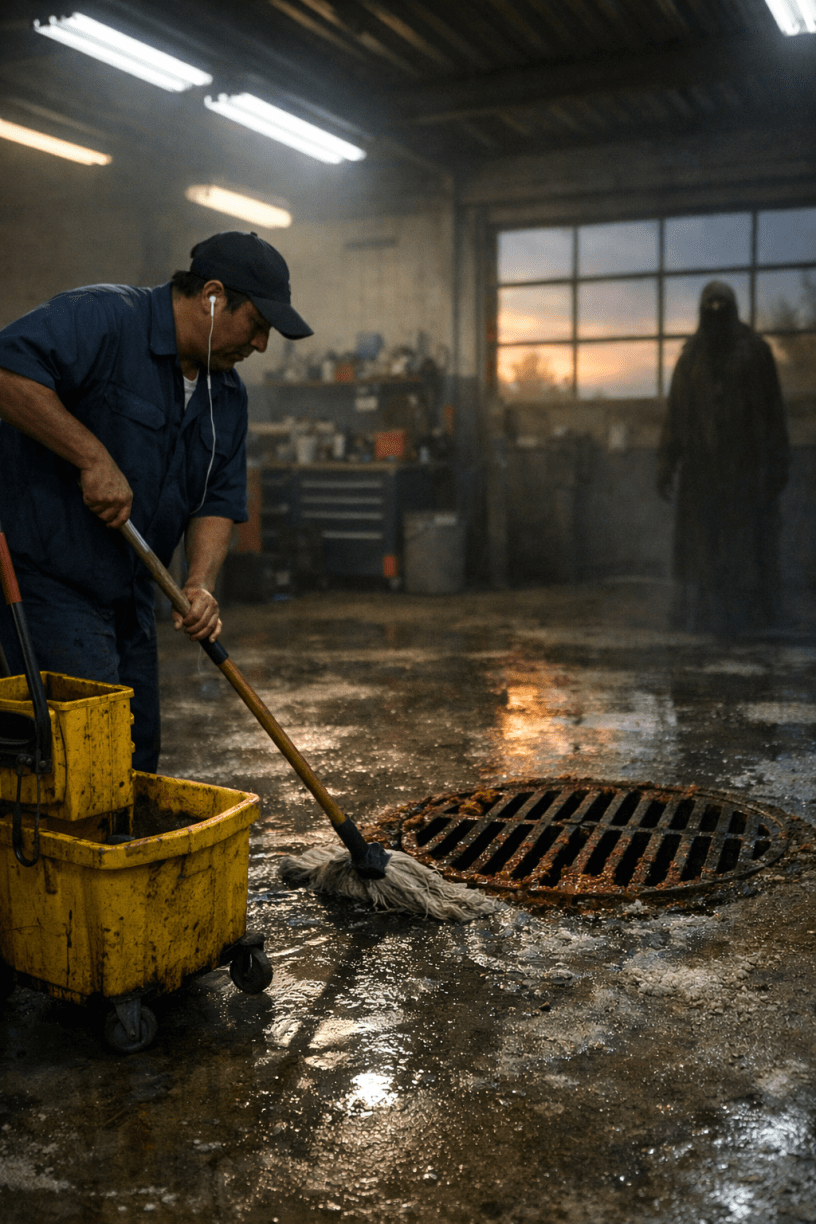 He started near the service bays, pushing the mop in long arcs, guiding the dirty water toward the central drain. The iron grate there was old, pitted, orange with rust, heavy enough that it never moved no matter what went over it. Everything ended up there eventually. Oil. Water. Slush. Whatever spilled got pulled down and forgotten.